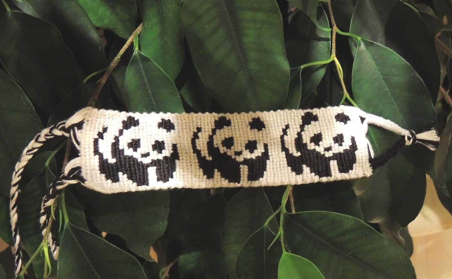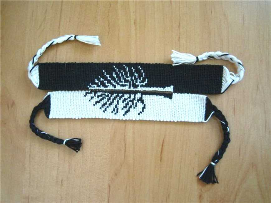 - Точно так же продолжаем плетение браслета в 2 цвета, завязывая узелки фона и рисунка в разных направлениях.