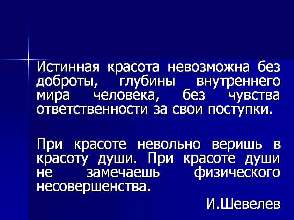 Важную роль для человечества всегда играло не только внешнее проявление прекрасного, но и красота внутренняя, которая идёт рука об руку с гармоничным развитием личности. Часто случается, что встретив людей, непривлекательных внешне, через некоторое время мы отмечаем, что они вызывают симпатию благодаря душевным качествам и степени внутреннего развития.