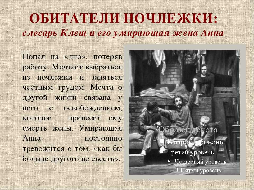 Кто же эти обитатели? Слесарь Клещ, жена его Анна, всю жизнь терпевшая побои, воришка Пепел, девушка легкого поведения Настя, алкоголик Актер, картузник, бывший барин и др. Все они – отчаявшиеся, бросившие надежду на светлое будущее люди.
