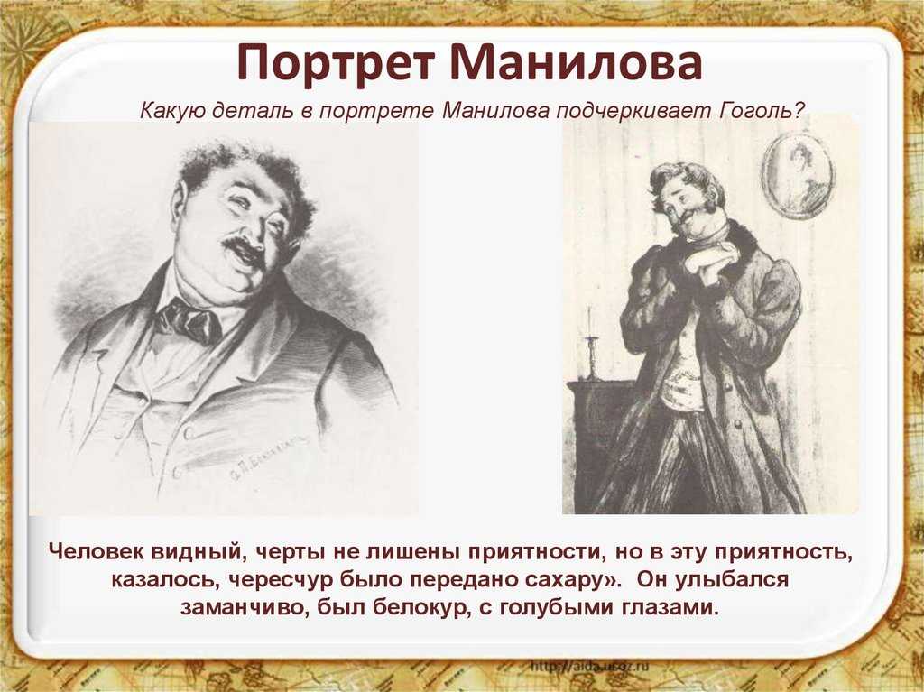 О первом жителе пригорода, которого посетил Павел Иванович Чичиков, читатель узнает достаточно много. Он отставной офицер, привыкший курить трубку еще с армейской службы. Восемь лет женат на Лизоньке, с которой имеет двух сыновей. Любовь между супругами напоминает истинное счастье. Они носят друг другу конфеты, яблоки, орешки, проявляя этим заботу. Говорят нежными голосами. Любовь своей излишней сентиментальностью напоминает пародию. Сыновья имеют такие имена, что на них нельзя не остановиться: Алкид и Фемистоклюс. Родители хотели выделить своих детей из толпы хотя бы именами. Манилов представляет себя западником, человеком, который строит свою жизнь на европейский манер, но из этого получается абсурд и несуразица.
