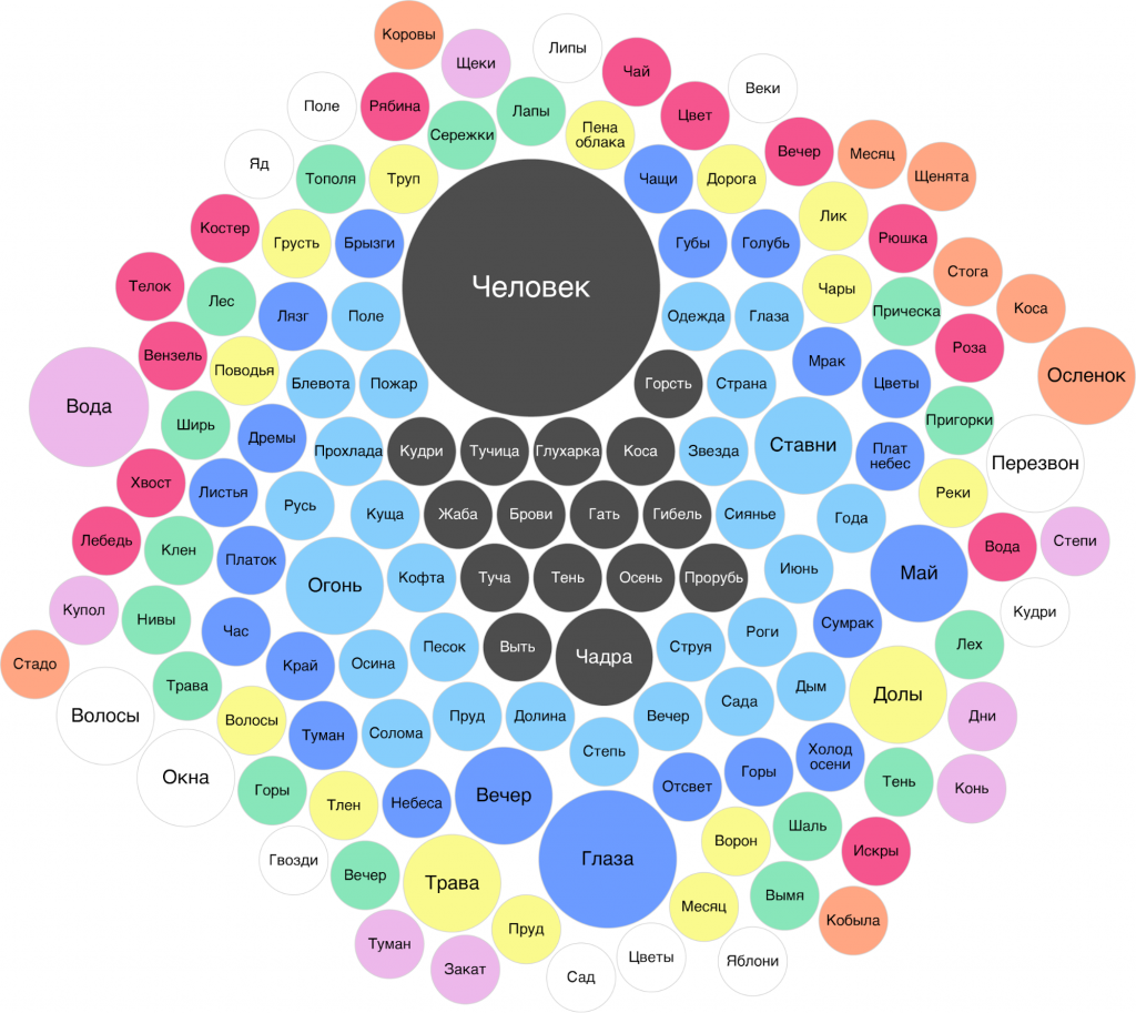белый Гвозди (метели) Окна (2 раза) Цветы Яблони Поле Сад Липы Перезвон (2 раза) Кудри Веки (луны) Яд Волосы (2 раза)