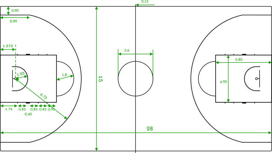 - Трехочковые линии представляют собой полукруги радиусом 6,75 м, проведённые до пересечения с параллельными (лицевыми) линиями.
