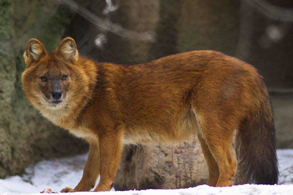 Редкий, вымирающий вид, волк с ярко-рыжей шерстью и пышным хвостом с черным кончиком. Живет и передвигается небольшими, по 8 – 15 особей, стаями. Охотится в утренние и дневные часы, ночью укрывается в скальных ущельях. Рацион красного волка состоит преимущественно из некрупных копытных. В поисках добычи волк может развивать скорость до 58 км/ч, совершать шестиметровые прыжки, бесстрашно переплывать реки с ледяной водой. Но, тем не менее, и в габаритах, и в силе и ловкости, и даже в количестве зубов он проигрывает своему серому собрату.