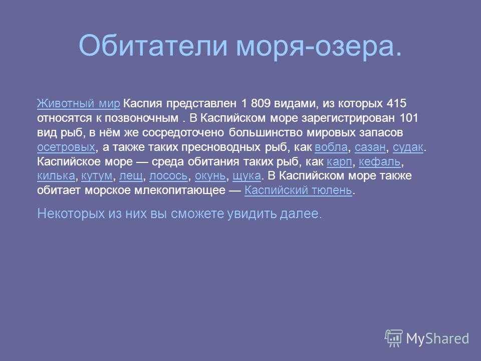 Обитатели моря-озера. Животный мирЖивотный мир Каспия представлен видами, из которых 415 относятся к позвоночным. В Каспийском море зарегистрирован 101 вид рыб, в нём же сосредоточено большинство мировых запасов осетровых, а также таких пресноводных рыб, как вобла, сазан, судак. Каспийское море среда обитания таких рыб, как карп, кефаль, килька, кутум, лещ, лосось, окунь, щука. В Каспийском море также обитает морское млекопитающее Каспийский тюлень. осетровыхвобласазансудаккарпкефаль килькакутумлещлососьокуньщукаКаспийский тюлень Некоторых из них вы сможете увидить далее.
