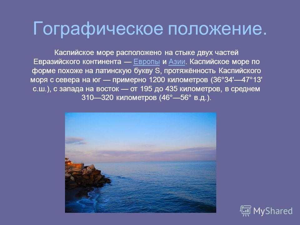 Гографическое положение. Каспийское море расположено на стыке двух частей Евразийского континента Европы и Азии. Каспийское море по форме похоже на латинскую букву S, протяжённость Каспийского моря с севера на юг примерно 1200 километров (36°34’47°13′ с.ш.), с запада на восток от 195 до 435 километров, в среднем километров (46°56° в.д.).ЕвропыАзии
