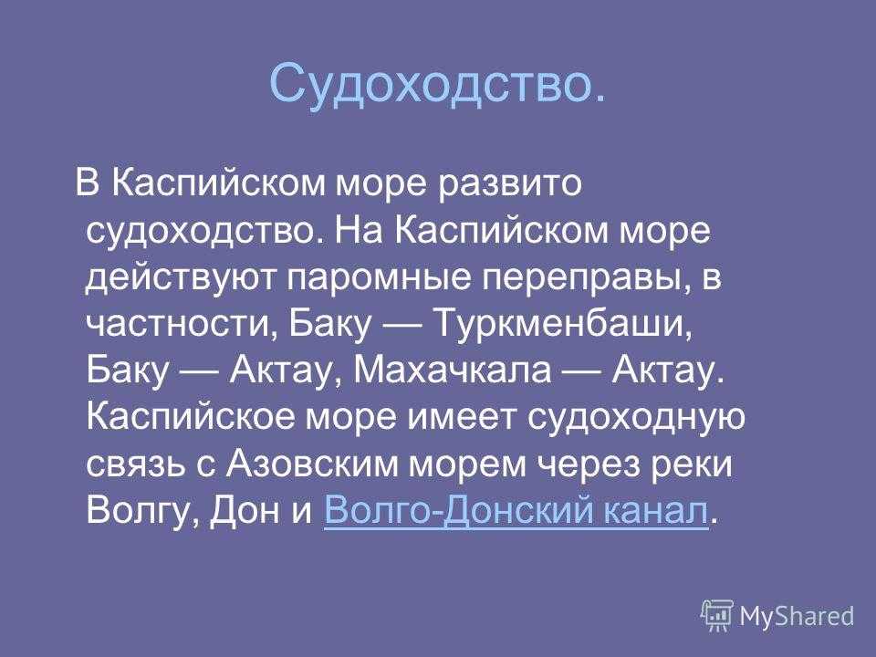 Судоходство. В Каспийском море развито судоходство. На Каспийском море действуют паромные переправы, в частности, Баку Туркменбаши, Баку Актау, Махачкала Актау. Каспийское море имеет судоходную связь с Азовским морем через реки Волгу, Дон и Волго-Донский канал.Волго-Донский канал