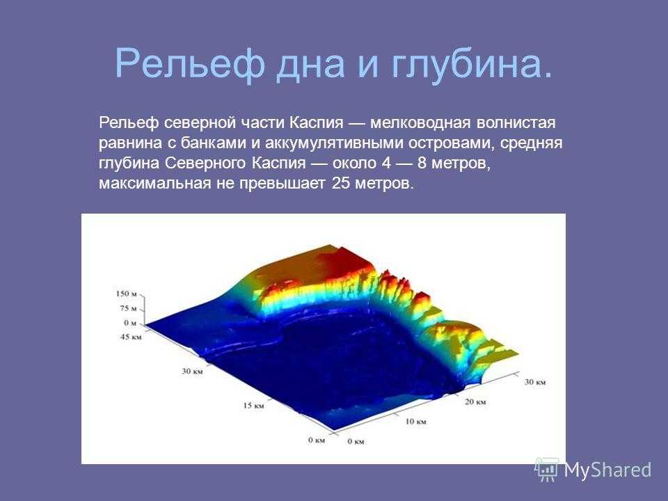 Рельеф дна и глубина. Рельеф северной части Каспия мелководная волнистая равнина с банками и аккумулятивными островами, средняя глубина Северного Каспия около 4 8 метров, максимальная не превышает 25 метров.
