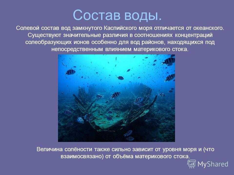 Состав воды. Солевой состав вод замкнутого Каспийского моря отличается от океанского. Существуют значительные различия в соотношениях концентраций солеобразующих ионов особенно для вод районов, находящихся под непосредственным влиянием материкового стока. Величина солёности также сильно зависит от уровня моря и (что взаимосвязано) от объёма материкового стока.