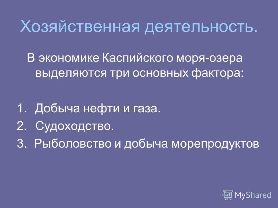 Хозяйственная деятельность. В экономике Каспийского моря-озера выделяются три основных фактора: 1.Добыча нефти и газа. 2.Судоходство. 3. Рыболовство и добыча морепродуктов