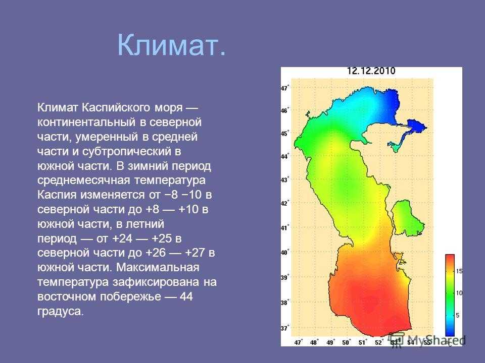 Климат. Климат Каспийского моря континентальный в северной части, умеренный в средней части и субтропический в южной части. В зимний период среднемесячная температура Каспия изменяется от 8 10 в северной части до в южной части, в летний период от в северной части до в южной части. Максимальная температура зафиксирована на восточном побережье 44 градуса.