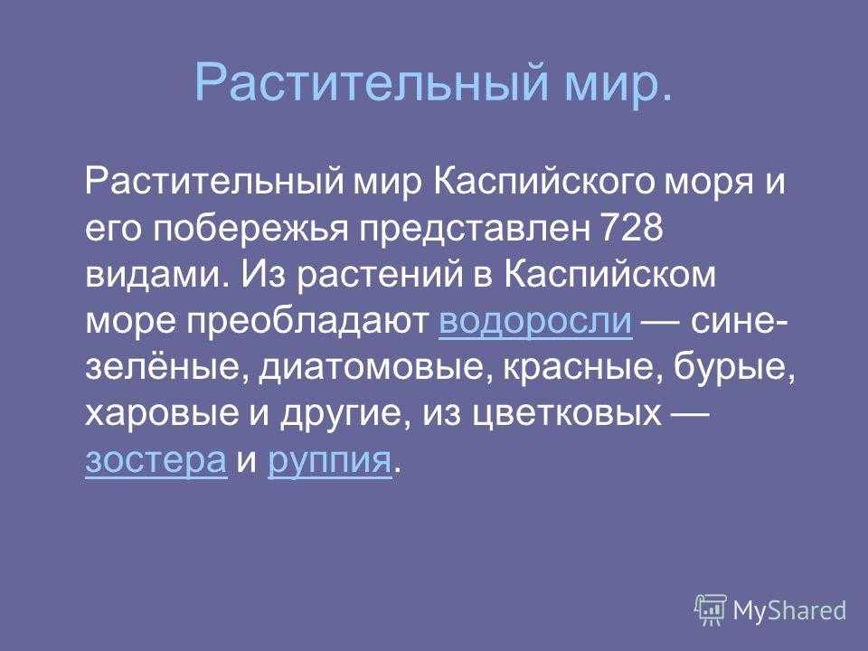 Растительный мир. Растительный мир Каспийского моря и его побережья представлен 728 видами. Из растений в Каспийском море преобладают водоросли сине- зелёные, диатомовые, красные, бурые, харовые и другие, из цветковых зостера и руппия.водоросли зостераруппия