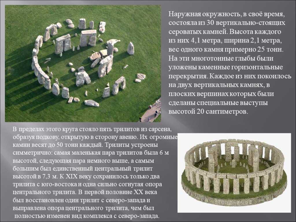 - Около 2000 г. до н.э. — строительство внешнего круга из сарсеновых камней, которые добывали в Северном Уилтшире (примерно 30 км от Стоунхенджа). Самый большой из этих камней весит около 50 тонн. Просто невероятно, как удалось его доставить сюда и установить.