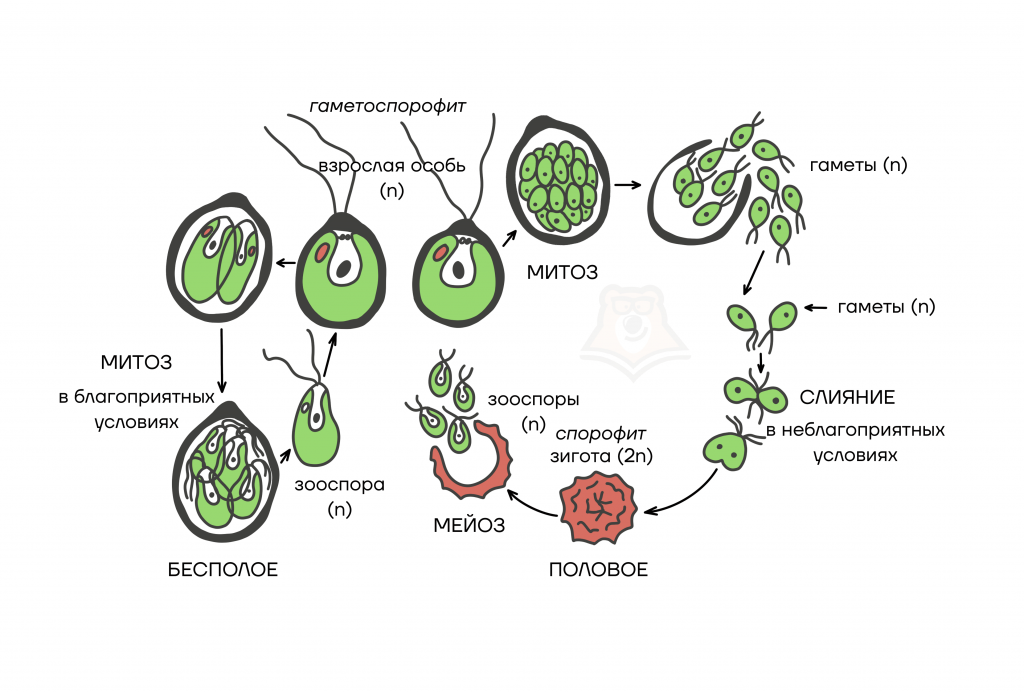 | Почему взрослая хламидомонада всегда погибает при “родах”?При бесполом размножении цитоплазма внутри клетки делится много раз митозом, разрывая целлюлозную оболочку. Получается, взрослая водоросль никогда не выживает при появлении “детей”.Вышедшие из клетки гаметы попарно сливаются, образуя зиготу, которая далее делится мейозом на 4 зооспоры. Каждая из зооспор затем превращается во взрослую водоросль. |
