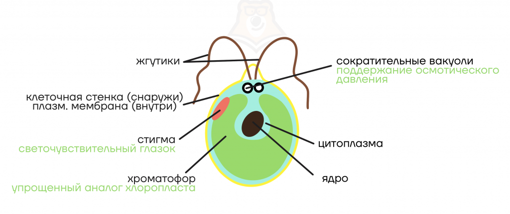 В передней части клетки располагаются 2 жгутика. Фотосинтезирующий аппарат представлен крупным чашевидным хроматофором, заполняющим практически всю цитоплазму клетки. Зёрна крахмала скапливаются в центральной области хроматофора — пиреноиде. Имеется светочувствительный органоид – стигма.