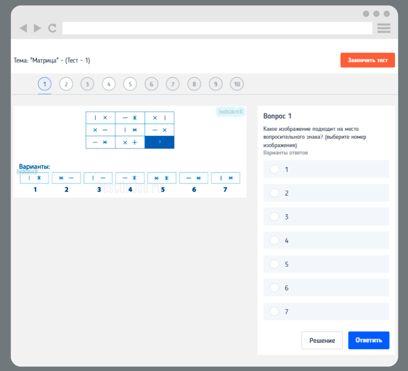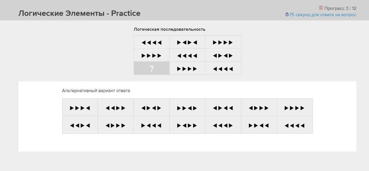 Логический тест Talent Q – это задачи, оценивающие абстрактное мышление и когнитивные способности. Для оценки используются логические матрицы размером 3*3 ячейки. Символы в ячейках меняются по определенной последовательности, которую требуется определить. В тестировании используется до 12 матриц с разными символами. На каждую дается 75 секунд.