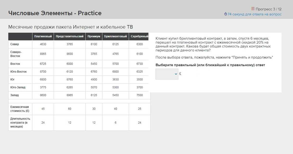 Числовые тесты оценивают навыки работы с числами, диаграммами, таблицами и графиками. Оцениваются навыки анализа – то есть то, как быстро человек ориентируется в условии и находит тактику решения. В основном кандидатам придется вычислять проценты, доли, составлять пропорции. Угадать ответ не получится – у Talent Q, к примеру, до 10 вариантов ответов.