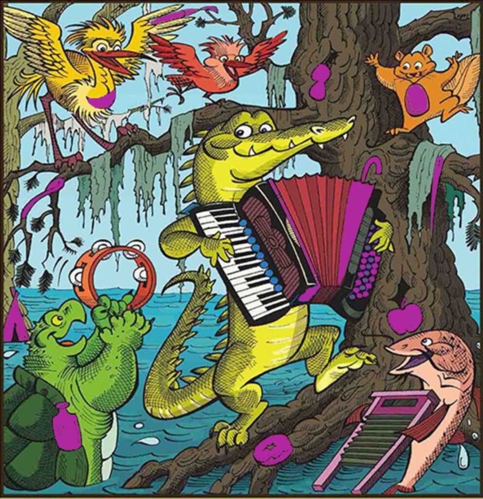 Художник изобразил крокодила, черепаху и карпа, которые решили повеселить лесной народ музыкой. Слетелись птицы и прискакала белка. В общем создалась веселая атмосфера